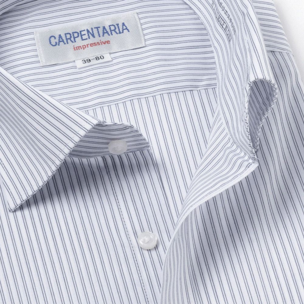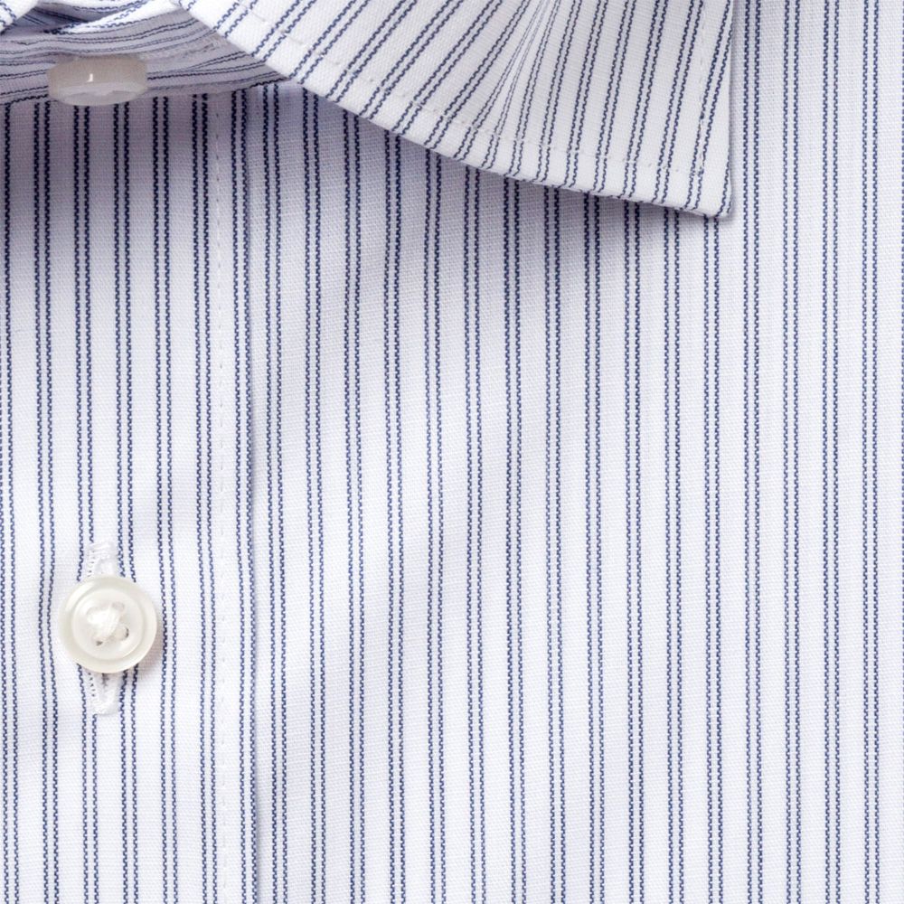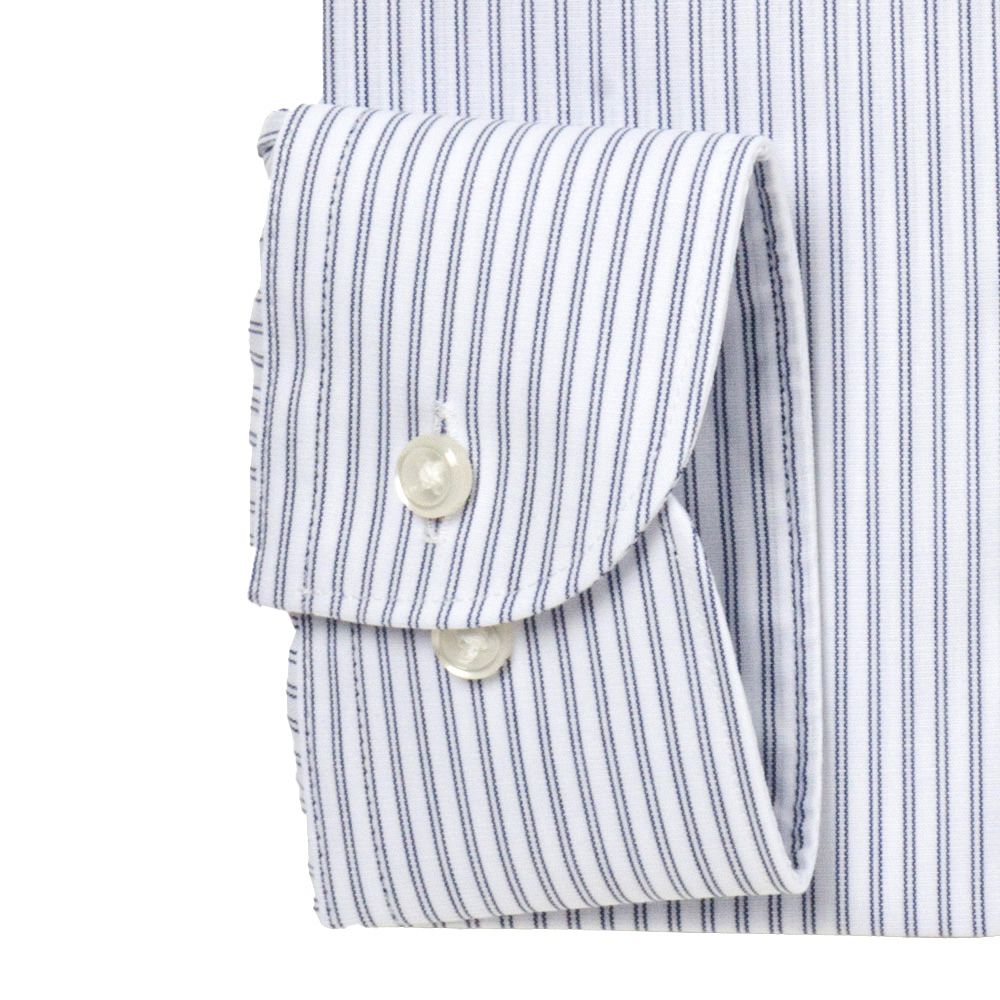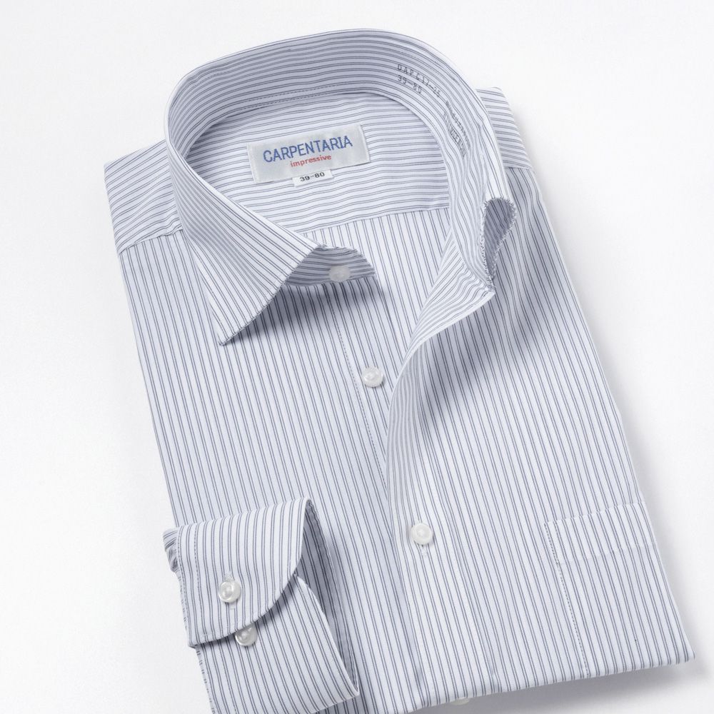 商品説明清涼感のある白場ネイビーダブルストライプ。衿は首回りがすっきり見えるセミワイドカラー。 |