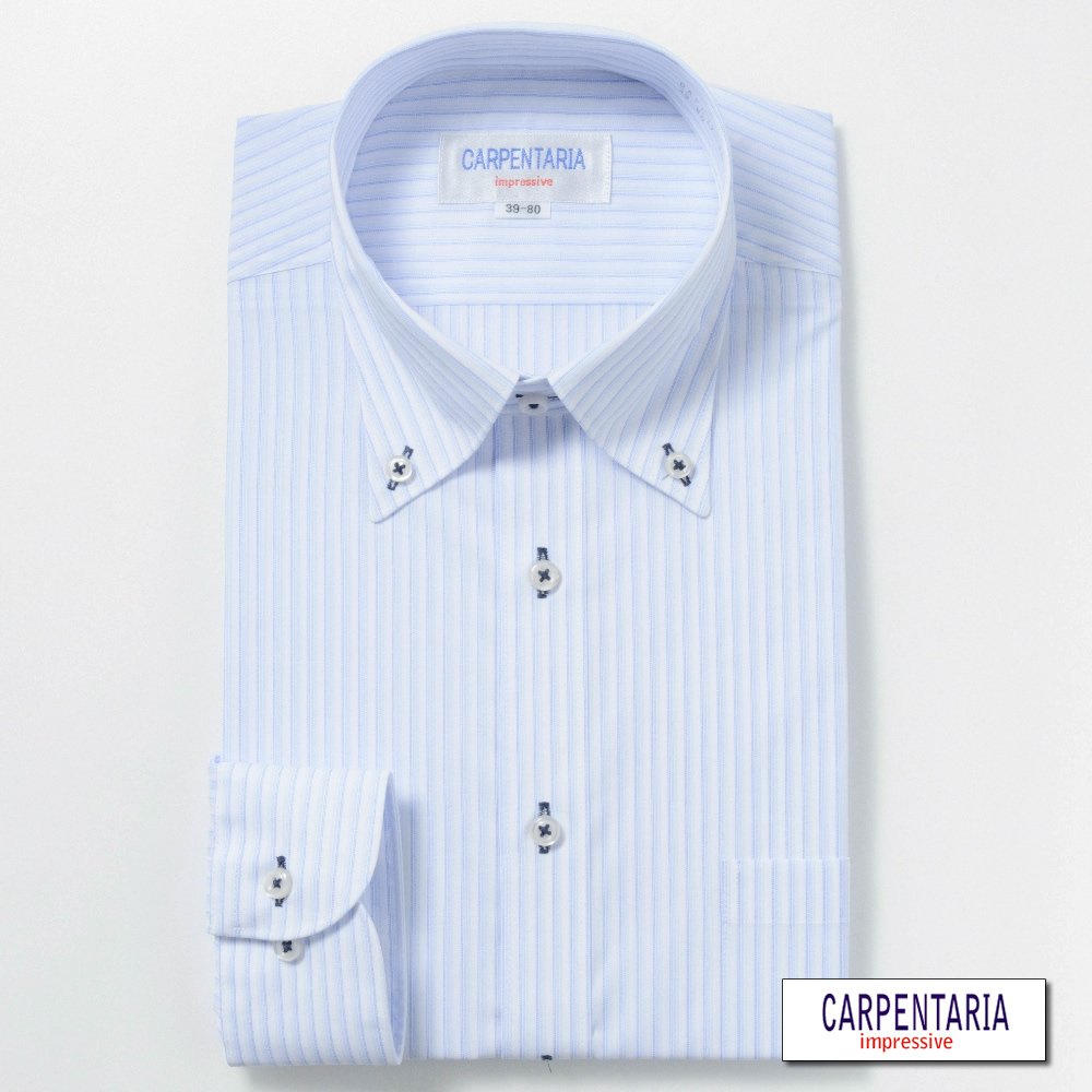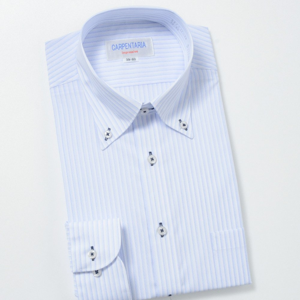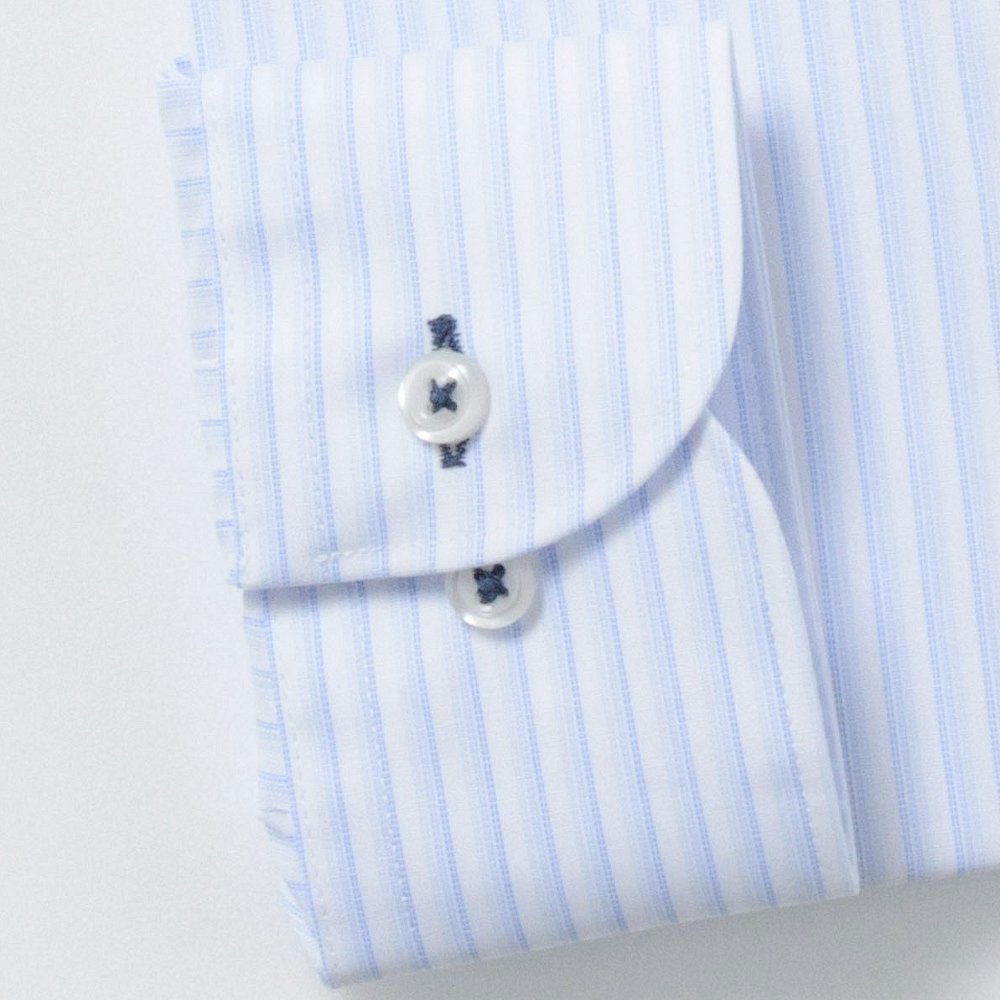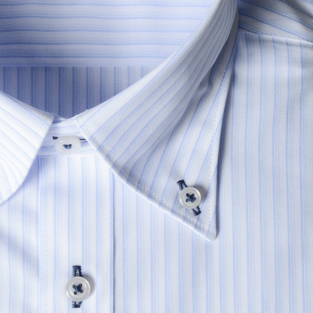 商品説明爽やかな印象のブルーストライプに釦ホール・付け糸はネイビーを使いアクセントをつけました。衿はノーネクタイでも着用しやすいボタンダウンカラー。 |