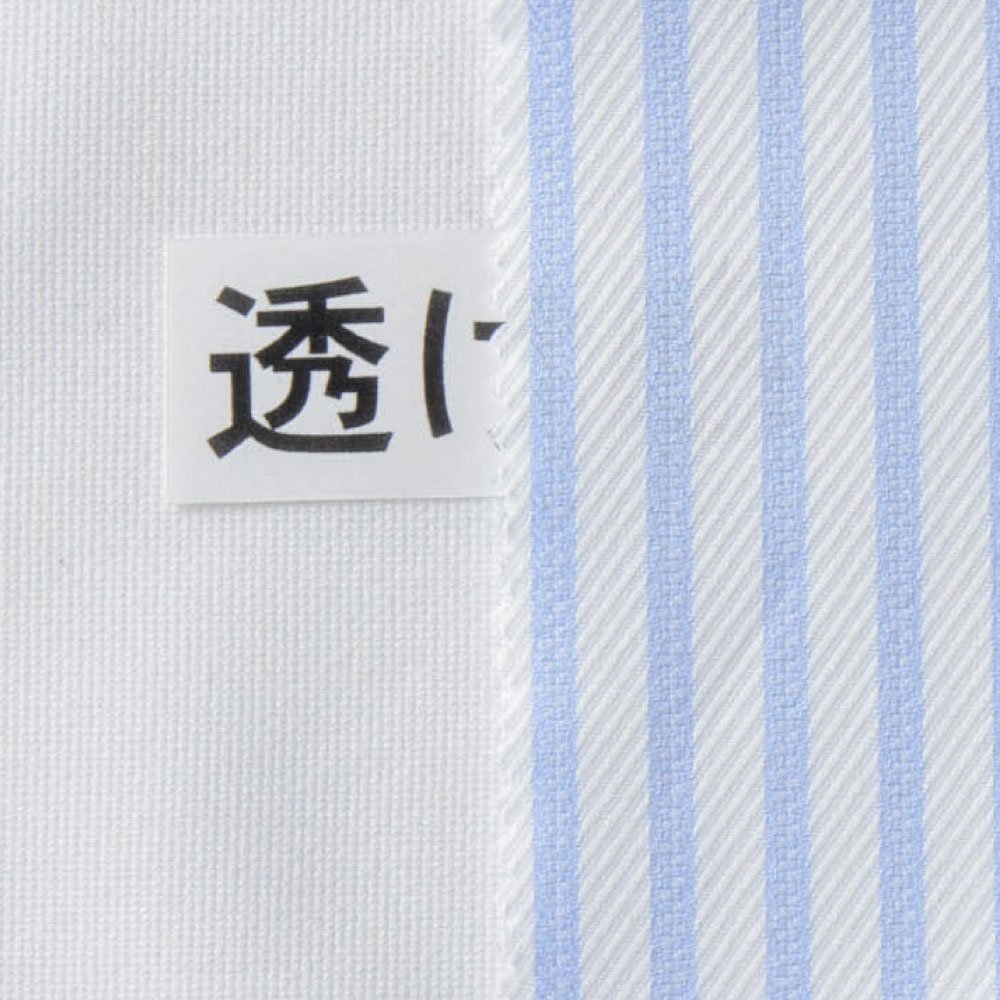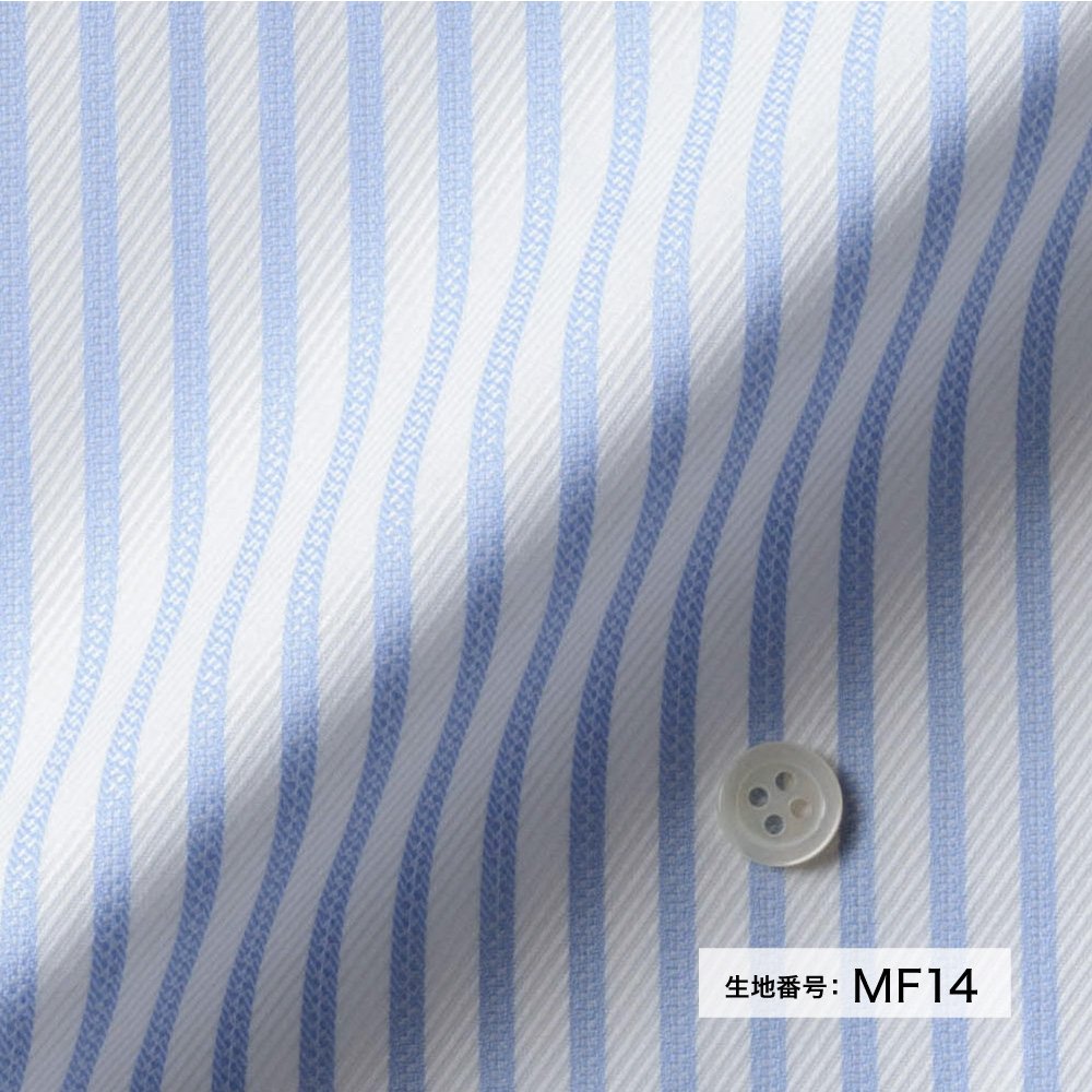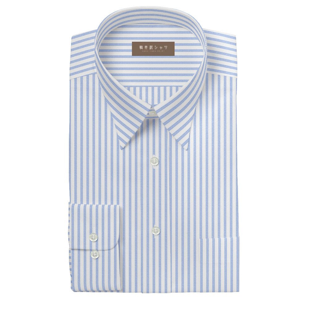 商品説明ホワイトベースサックスストライプ生地。ホワイト部分がツイル織りとなっており、上品な光沢感があります。 |