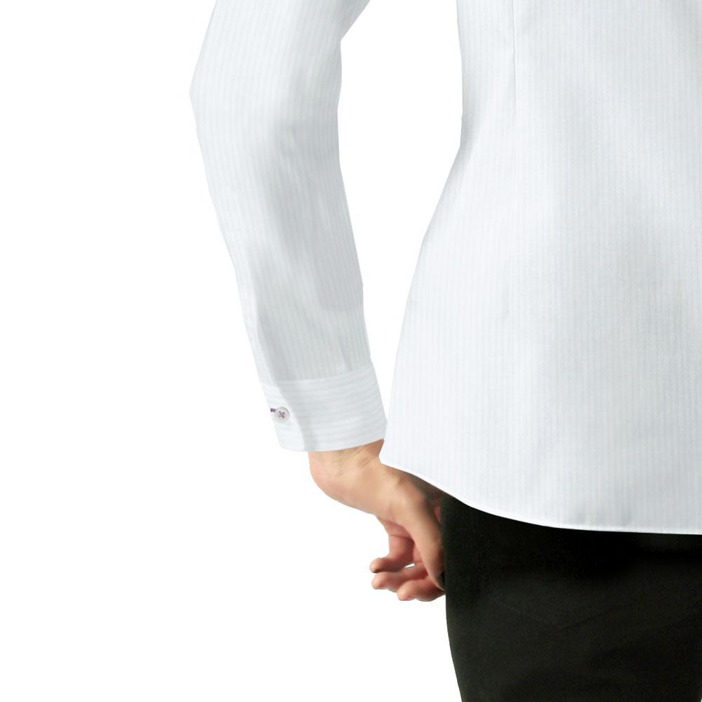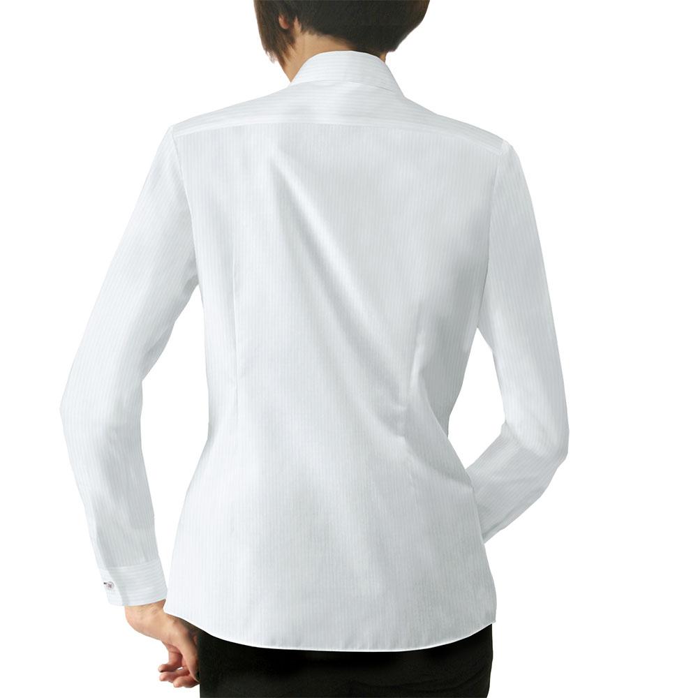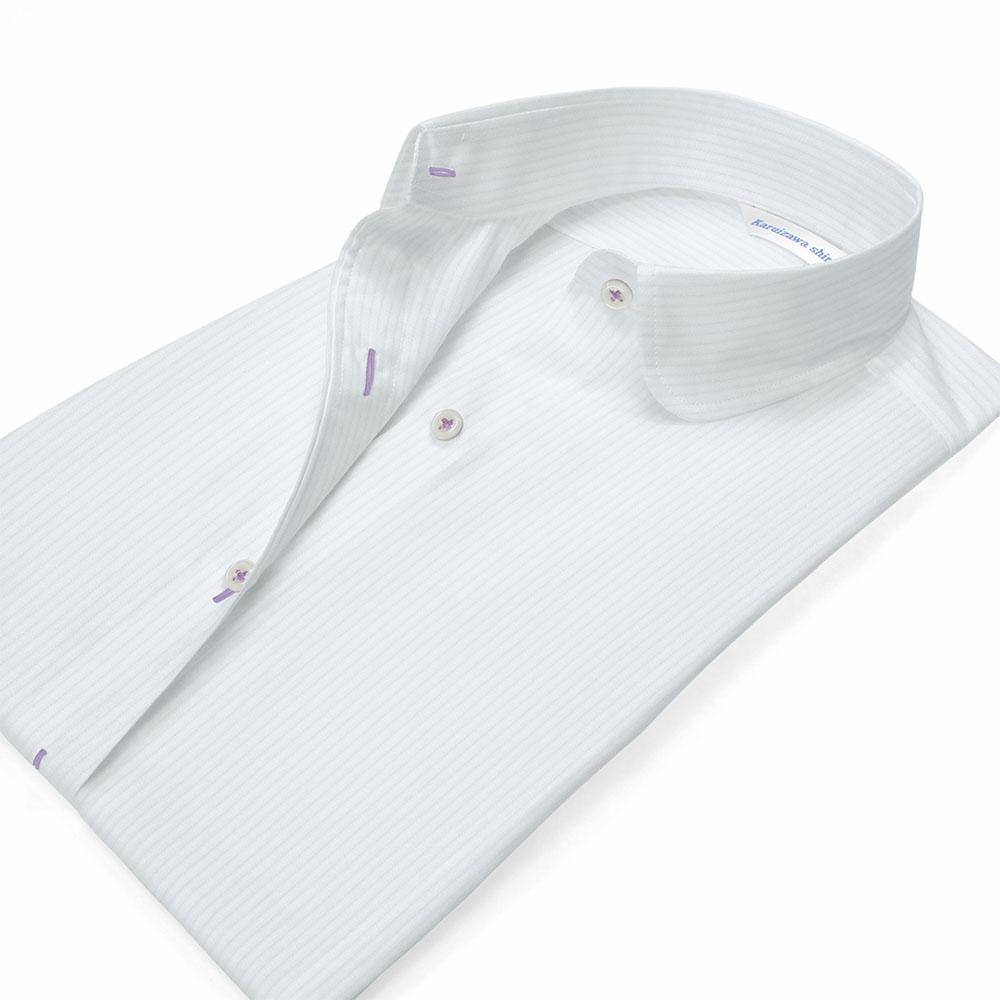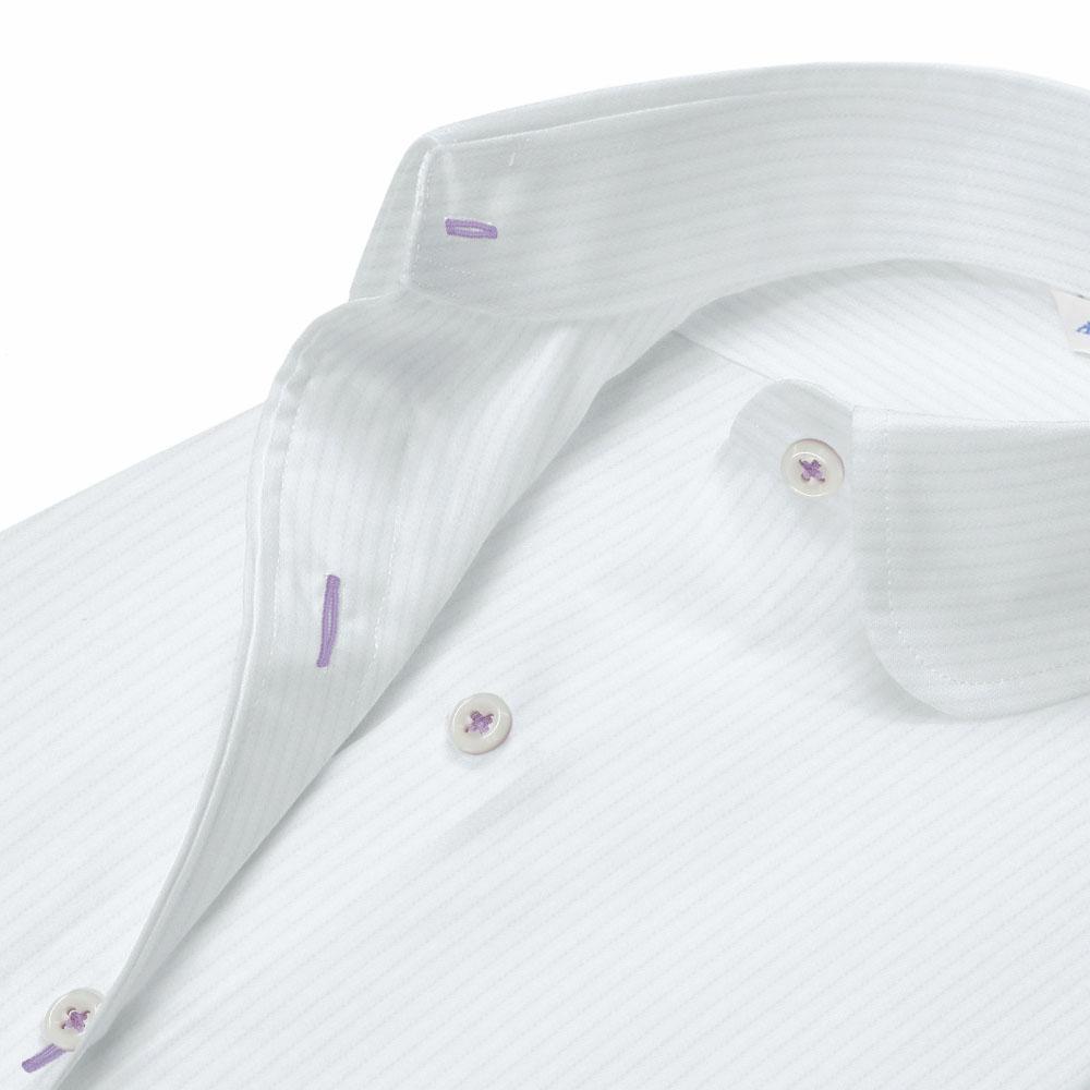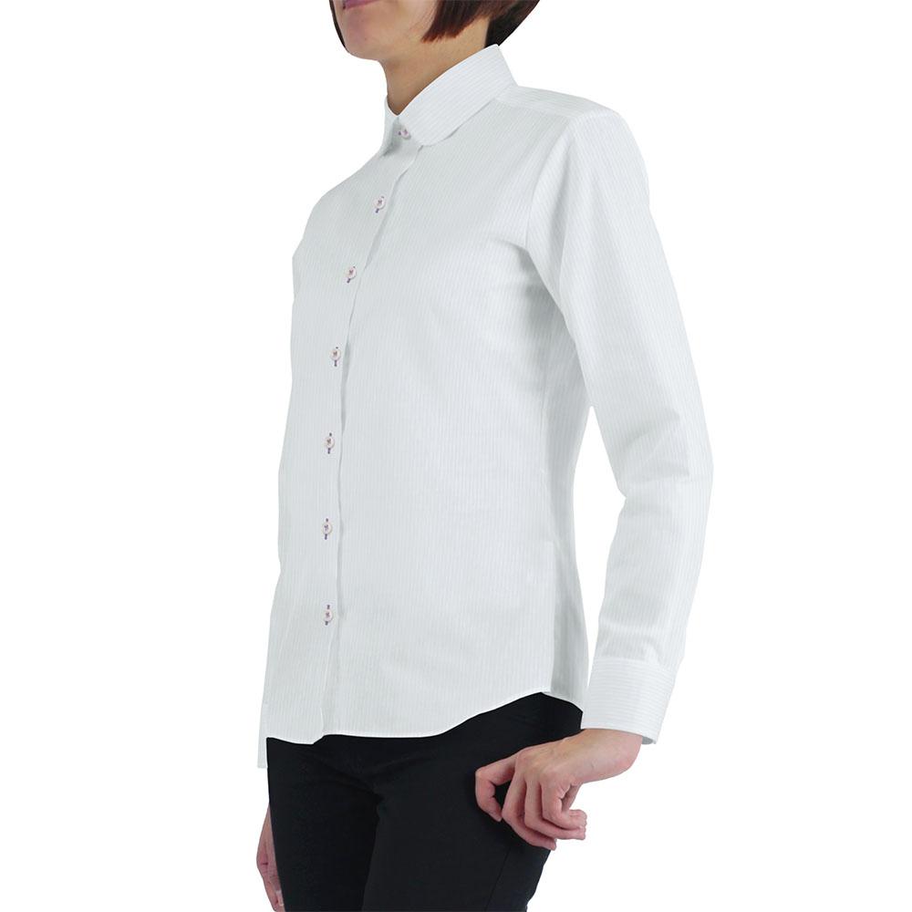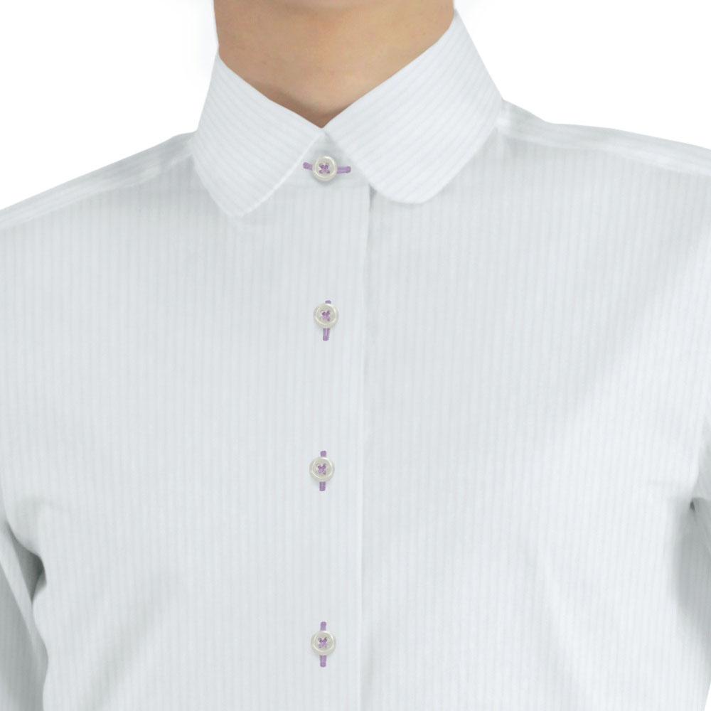 商品説明滑らかな触り心地が気持ち良い綿100%の生地の、清涼感あるホワイトドビーストライプ生地シャツ。衿は女性らしい印象を与えてくれるラウンドカラー。ホワイト×ライトパープルの二層釦ボタンに、穴篝、付け糸にもラベンダーカラーの糸を使用。ビジネスからカジュアルまで着こなしやすいアイテムです♪ |