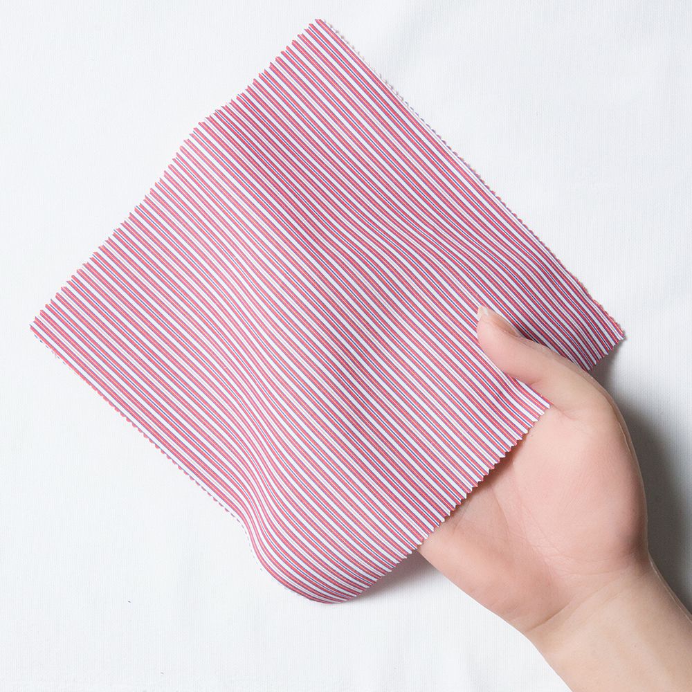 商品説明100番手双糸を使用した白×レッド×ブルーストライプ生地です。綿100%(超長綿)ならでは艶やかな光沢感としなやかな風合いが特徴の素材です。 |