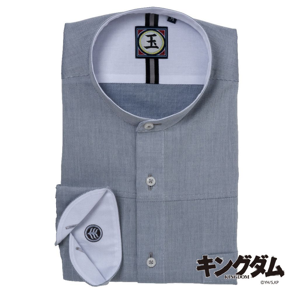 商品説明原泰久氏による日本の漫画作品『キングダム』のキャラクター王賁が率いる「玉鳳隊」をイメージしたデザインカジュアルシャツです。グレードビーストライプ柄生地のバンドカラー。前身頃は上下ハギ仕様、ヨーク内側、衿腰内側とカフス内側にホワイトドビーストライプ柄の別生地を使用しアクセントに。右カフス内側に鎧の紋をモチーフにした刺繍、ヨーク内側に「玉鳳隊」の軍旗をあしらったブランドネームとイメージカラーのテープを施しました。白の釦に穴かがり糸、釦付け糸はグレーを使用しワンポイントに。ほど良いフィット感のボディベースで、羽織りとしてボトムアウトの着用にもおすすめの短め身丈で仕上げました。肌触りの良い綿100%素材です。 |
