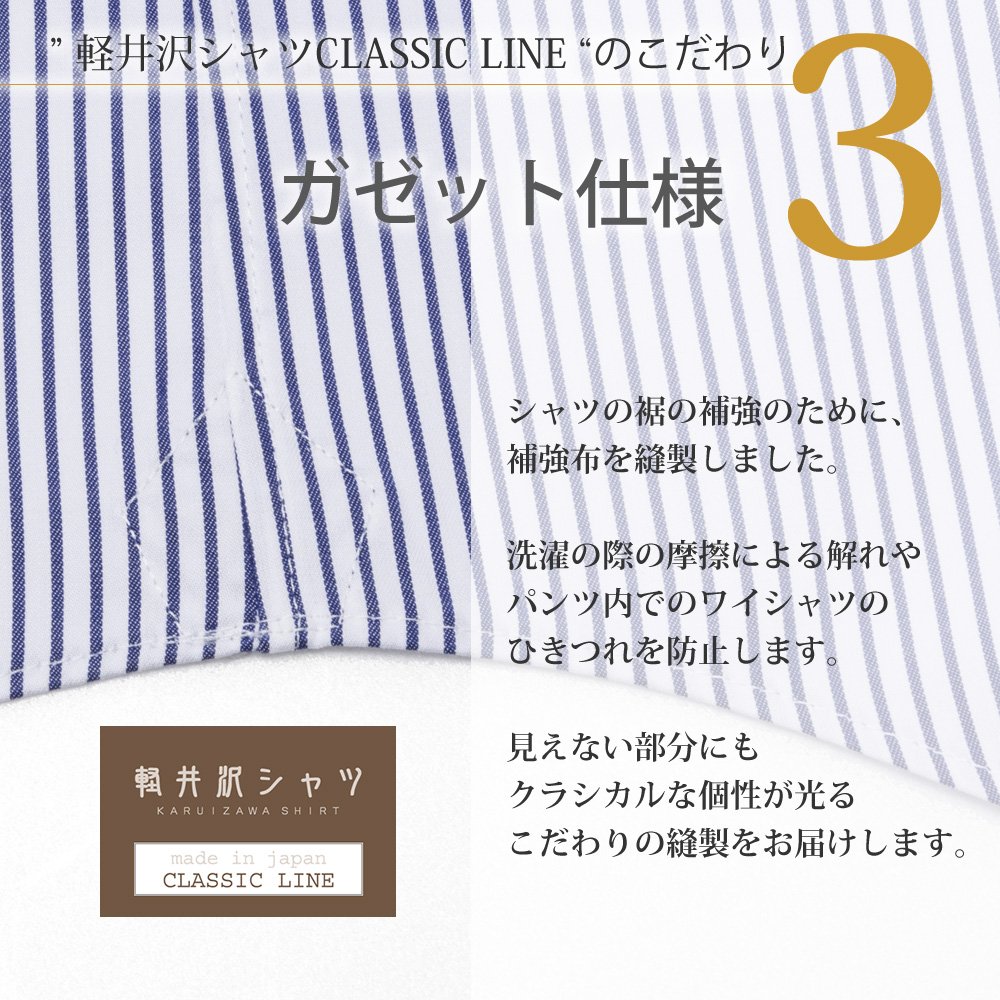 商品説明軽井沢シャツのクラシックラインは着心地の良い生地感と、イージーケア素材にこだわりを持った日本製シャツブランドです。すっきりと見えるドレスシャツらしい裏前立て仕様。袖付け・脇縫い本縫い縫製&脇裾ガセットで丈夫な仕立て。浮いていて着脱がしやすい根巻きボタン付け仕様。衿は衿元を綺麗に見せるボタンダウンカラー。肩部分を動きやすくするハギヨーク。生地は純綿素材にイージーケア加工を施したお手入れのしやすい、ホワイト×ネイビーストライプシャツ。ボタンは高瀬貝ボタンを使用し、より上品な印象に。着やすさ、扱いやすさ、美しさを併せ持ったこだわりのワイシャツをご提供します。 |