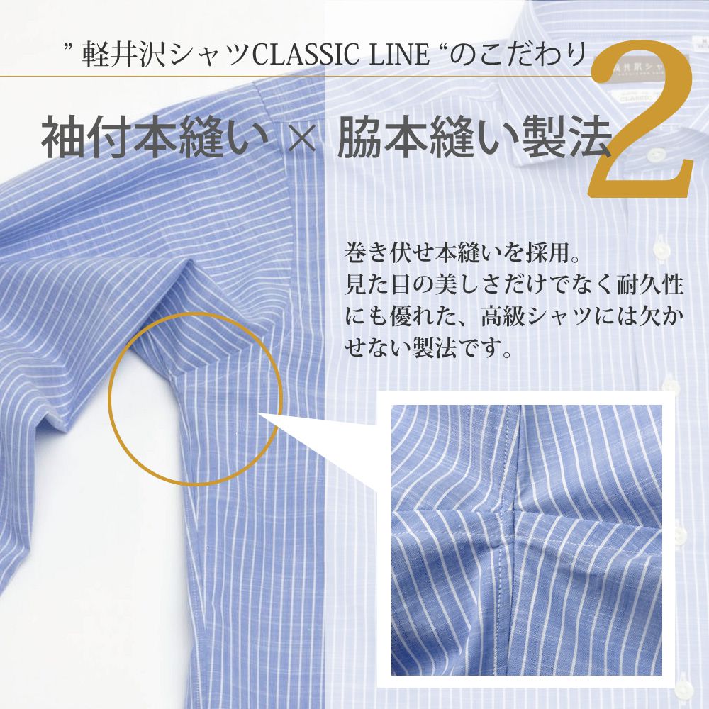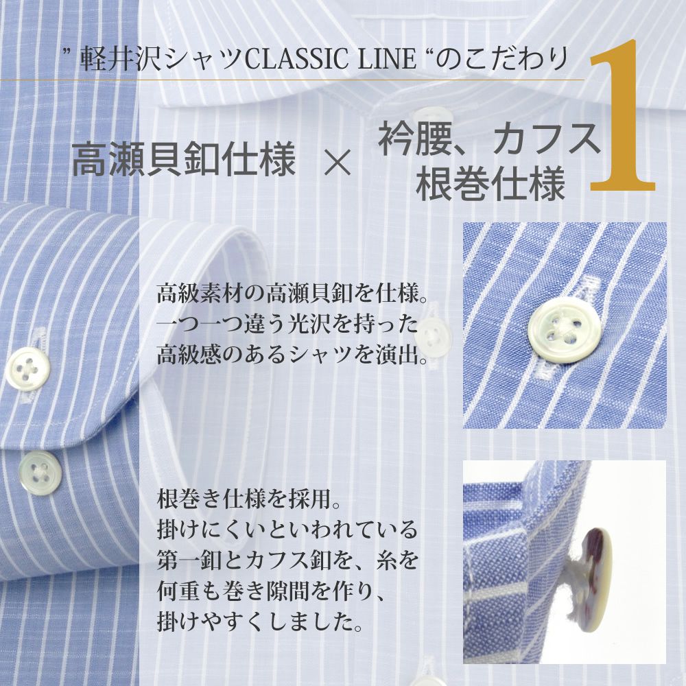 商品説明軽井沢シャツのクラシックラインは着心地の良い生地感と、イージーケア素材にこだわりを持った日本製シャツブランドです。すっきり見えるドレスシャツらしい裏前立て仕様。袖付け・脇縫い本縫い縫製&脇裾ガセットで丈夫な仕立て。浮いていて着脱がしやすい根巻きボタン付け仕様。衿はトレンドのワイドカラー。肩部分を動きやすくするハギヨーク。生地は純綿素材にイージーケア加工を施したお手入れのしやすい、ネイビー×ホワイトストライプシャツ。ボタンは高瀬貝ボタンを使用し、より上品な印象に。着やすさ、扱いやすさ、美しさを併せ持ったこだわりのワイシャツをご提供します。 |