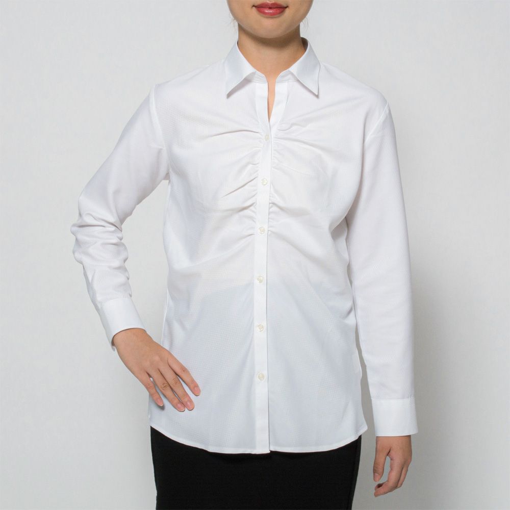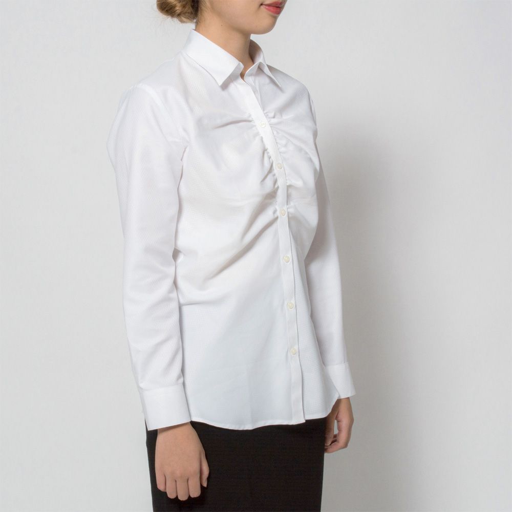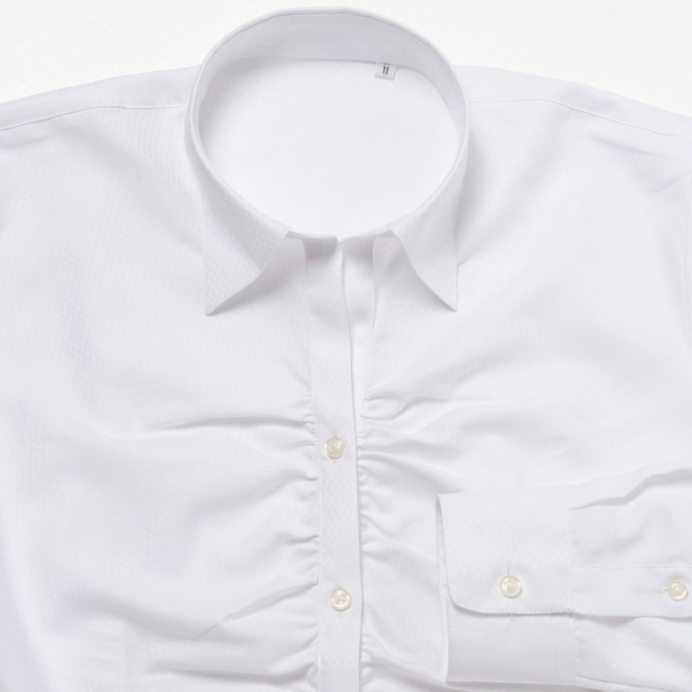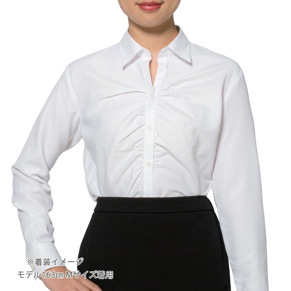 商品説明胸元にギャザーの入ったホワイトドビーダイヤ柄の長袖シャツです。衿はスキッパーカラー。 |