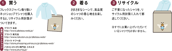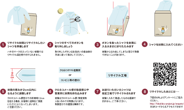 当社はFUKU-FUKUプロジェクトが提供する、この新しいライフスタイルに賛同しています。 まずはシャツ1枚から、リサイクル活動を始めませんか? |