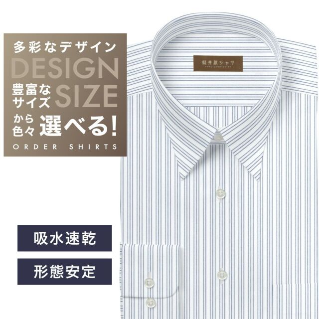 ワイシャツ[軽井沢シャツ] 自由に衿型を選べる 白×ネイビーストライプ 形態安定 吸水加工 形態安定 らくらくオーダー E10KZR875